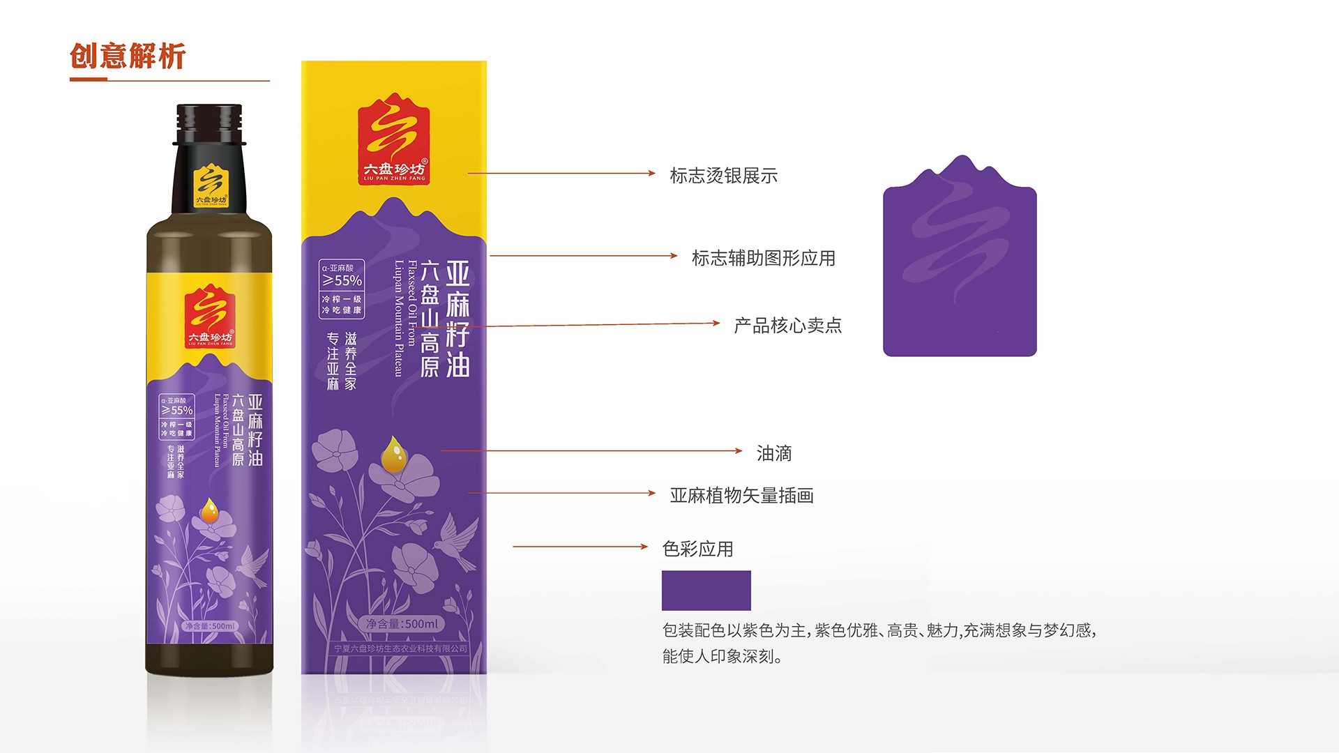 4、產品屬性:亞麻籽油是亞麻花的提取物,在女娃的設計上綠色手繩為亞麻花葉,衣裙為紫是亞麻花的顏色,裙子上的斑點是亞麻花,裙身下擺整體也勾勒出亞麻花的形態;男娃設定上,肚兜的斑點為亞麻籽。