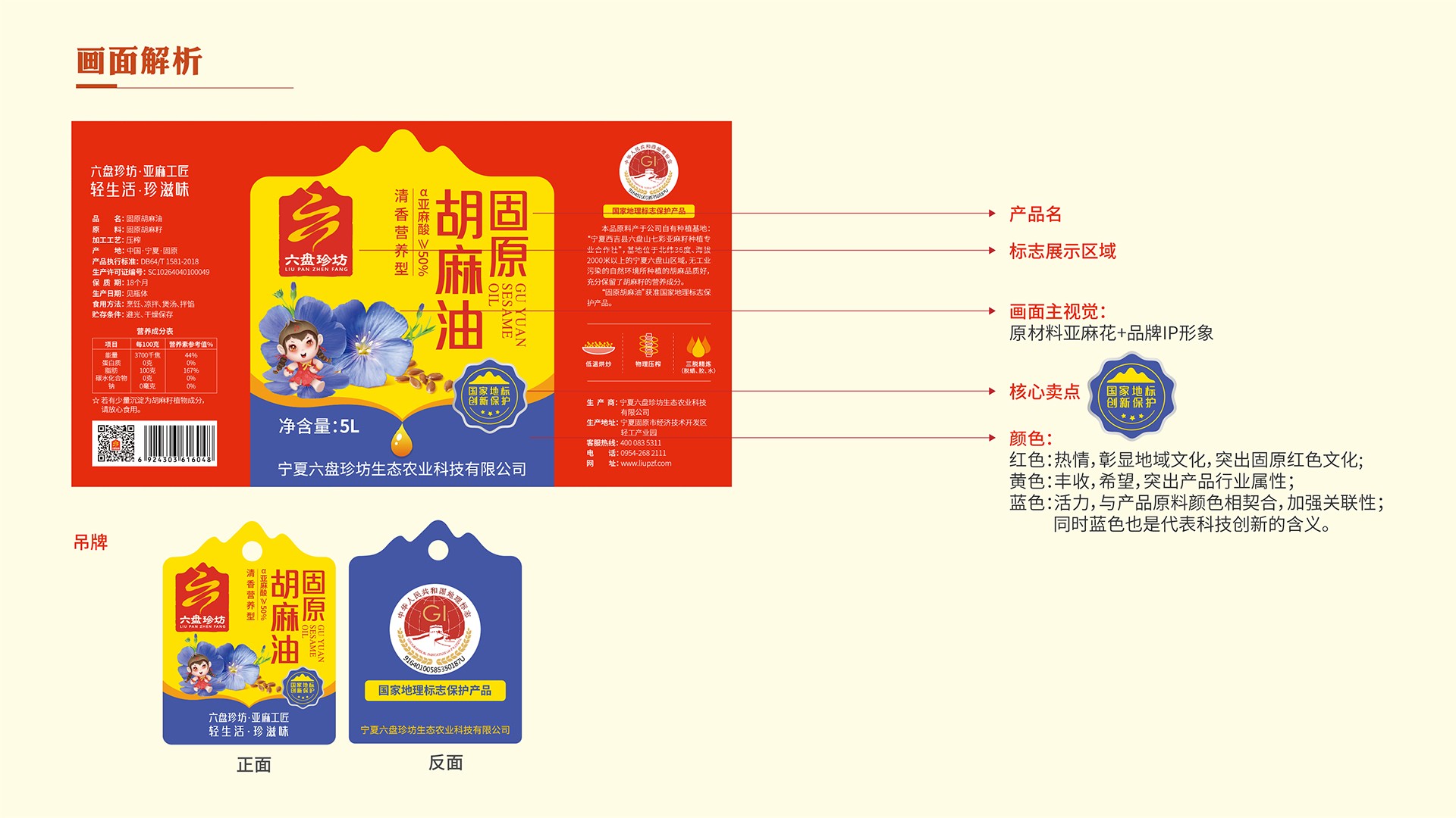 亞麻花生長在高寒冷涼的六盤山,結合氣候特征與六盤山的紅色文化,我們從冷、紅二字出發尋找六盤珍坊的形象代言人。冷靜的頭腦遇上紅色的熱情,一個生動的六盤山孩童形象躍然紙上,結合六盤珍坊的行業屬性、品牌調性與產品特性,賦予其完善的人格化色彩,取名“冷娃”,六盤珍坊的IP形象——冷娃誕生了!一個生動活潑的孩童將六盤珍坊與寧夏六盤山、亞麻籽油的產品屬性相連。